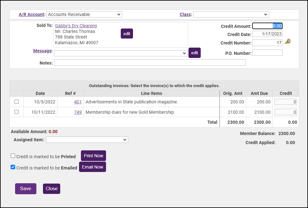 Type the credit amount in the Credit Amount field. If there are outstanding invoices displayed, the credit amount will automatically be applied to an open invoice. If you do not wish to apply the credit to an open invoice, deselect the checkbox next to the open invoice.