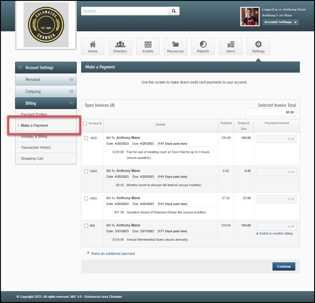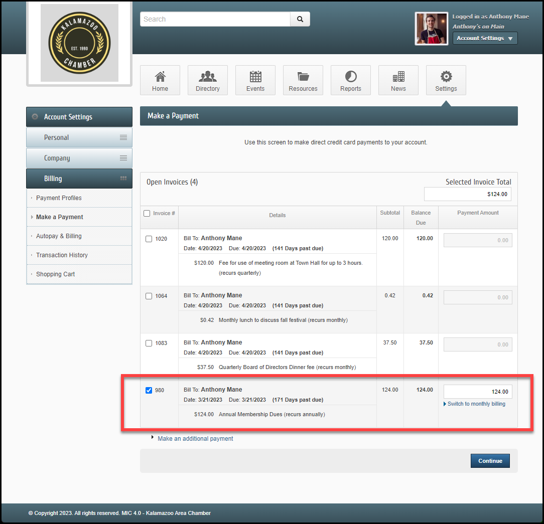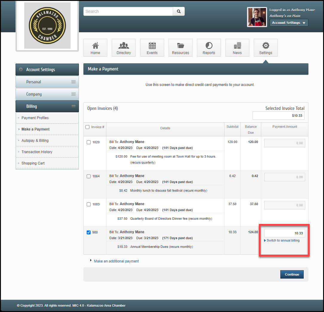 - Select an open invoice that has an annual frequency, like your membership dues.