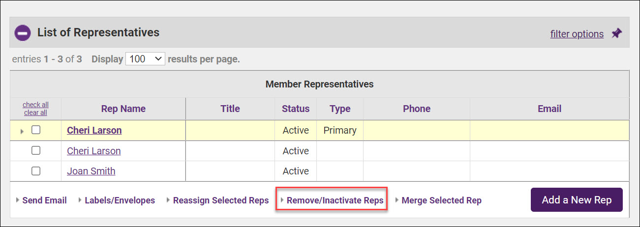 IMPORTANT: Only reps associated to the same member will be available for merging. Many times the duplicate reps occur when merging members together which is why this feature is only available to apply within the same member.. |