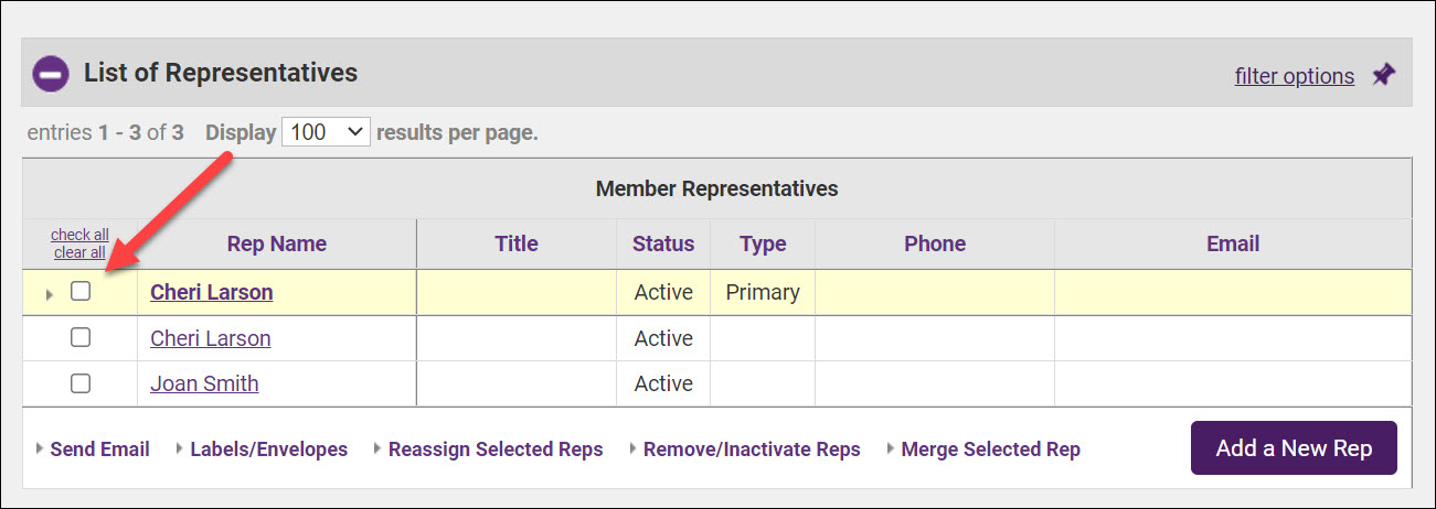 - On the Reps tab, check the box for the rep you wish to merge