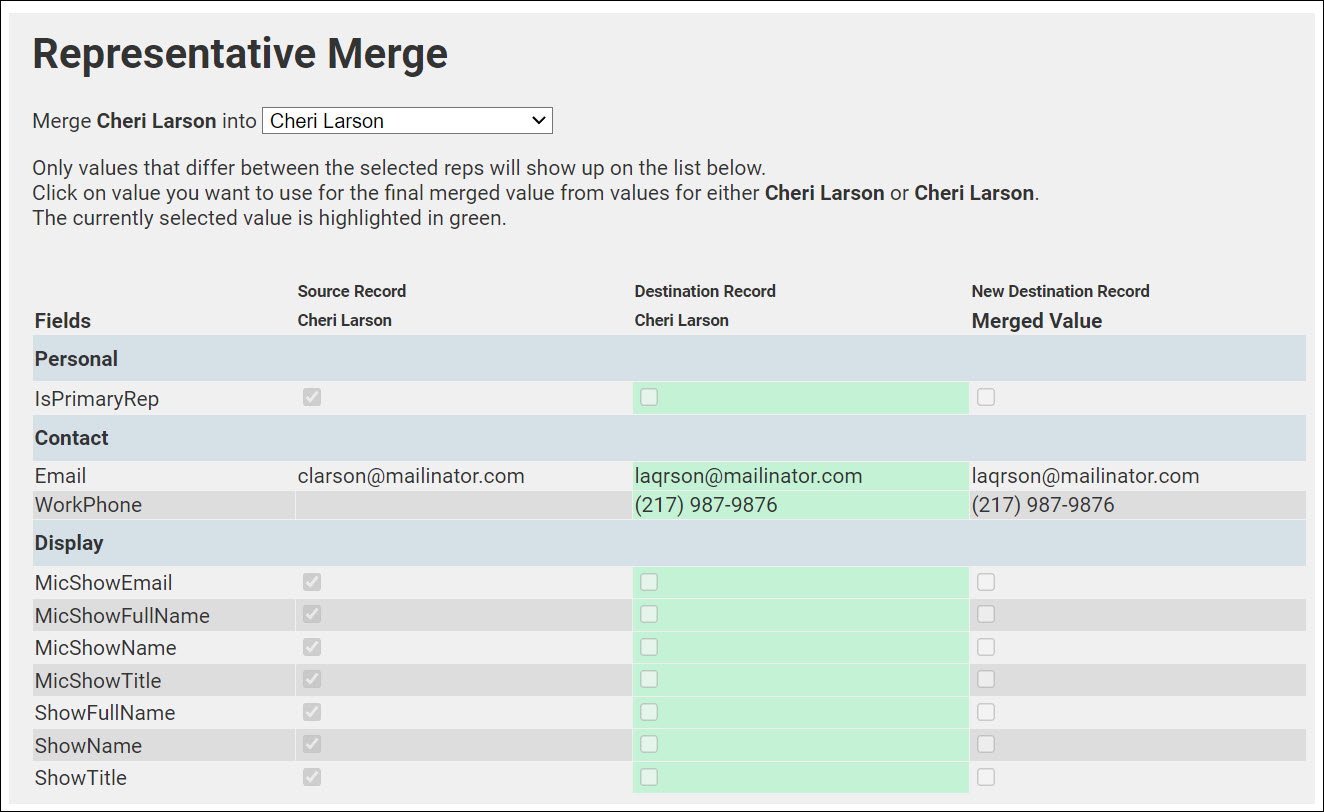 - From the list of fields that will be merged choose whether you wish to retain the information from the source record or the destination record. The items highlighted in green will be the information that will be retained in the final merged rep. Only those fields with differences are included in the list. Information brought over include personal details, address details, groups, permissions, display preferences, and custom fields.