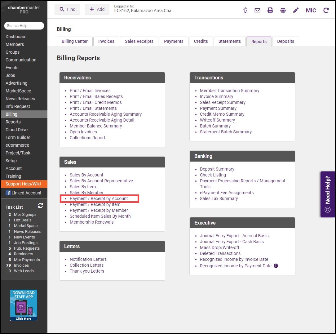 Click Payment/Receipt by Account in the Sales section.
