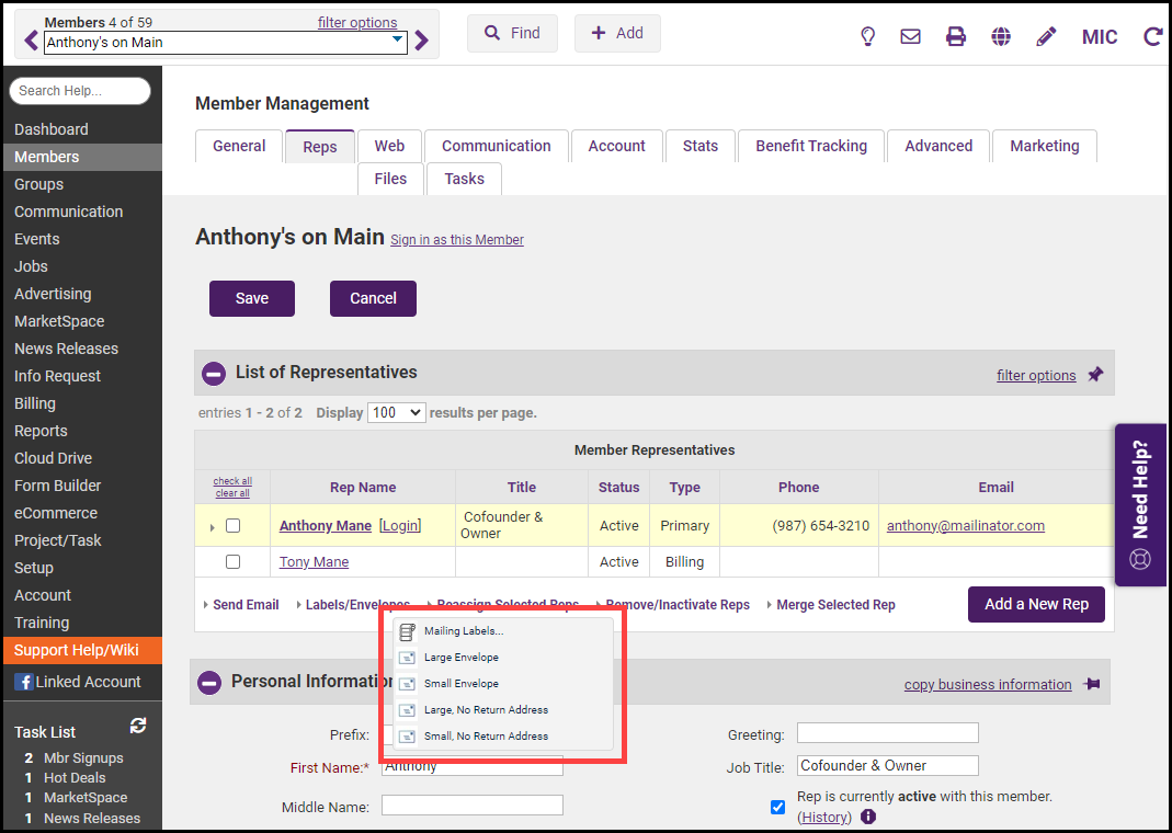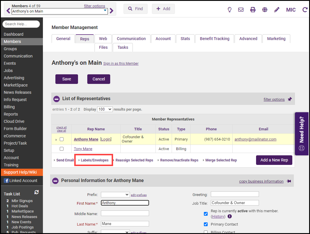 On the member's Reps tab, click the desired rep’s name in the List of Representatives area. The selected row will be shown in yellow.