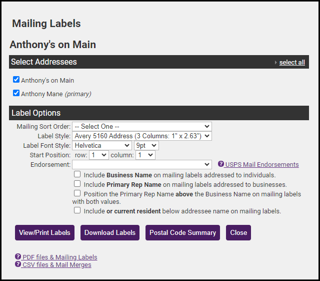 Complete the Mailing Labels screen.
