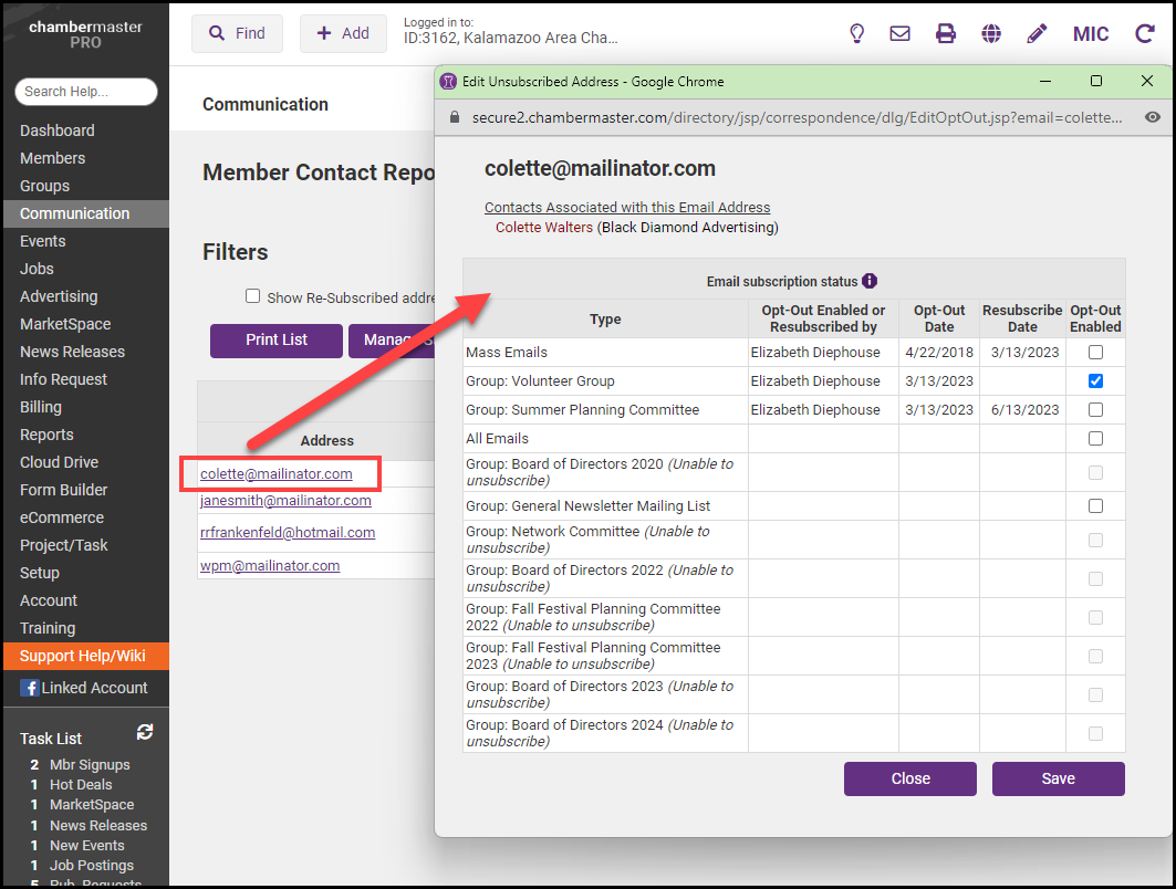 Select the email address of the member you would like to resubscribe. A list of all the groups the member has been unsubscribed from will be displayed.