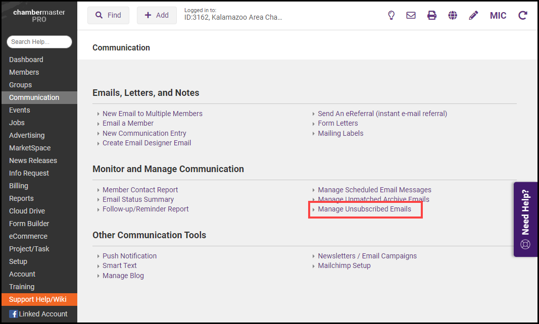 Click the Communications module on the left-hand menu.