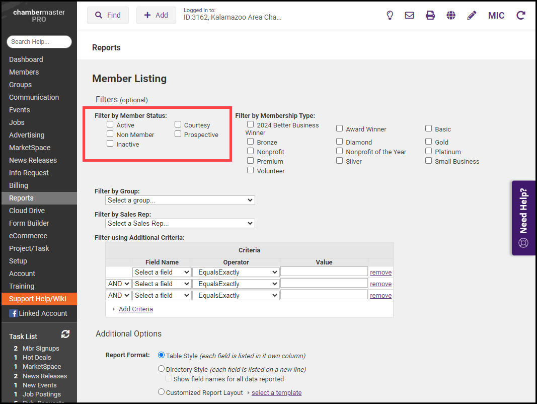- Select the checkbox next to the status you'd like to include in the report. Leave all of the checkboxes empty to generate a report including all Member Statuses.