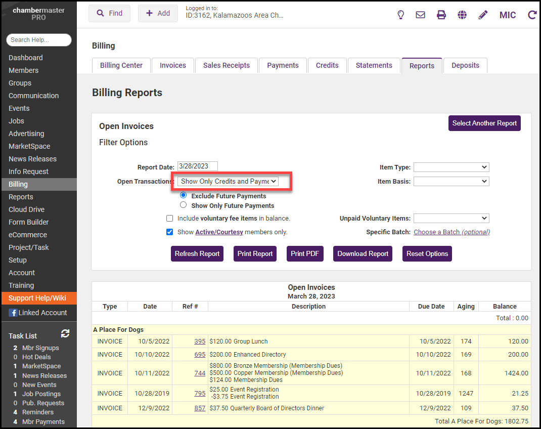 - Adjust filters, specifically the Open Transactions option to show Only Credits and Payments. From this report, you can open and review and even apply payments and credits if there are available open invoices.