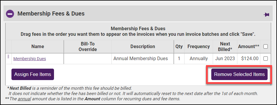 On the member's Account tab, click to select the check box in front of the fee/due that you wish to remove.
