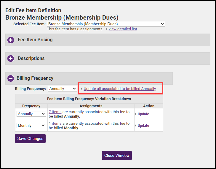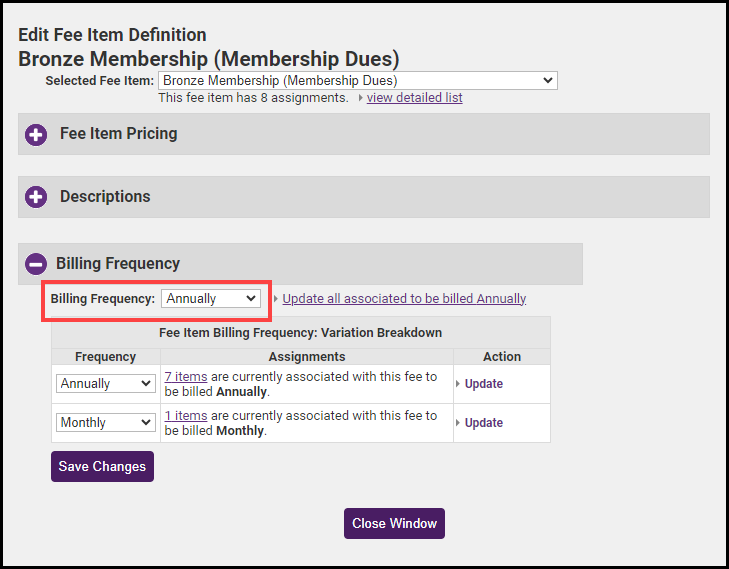 Click Save Changes. All members who have this fee item associated with their Billing tab will be updated to the new frequency.