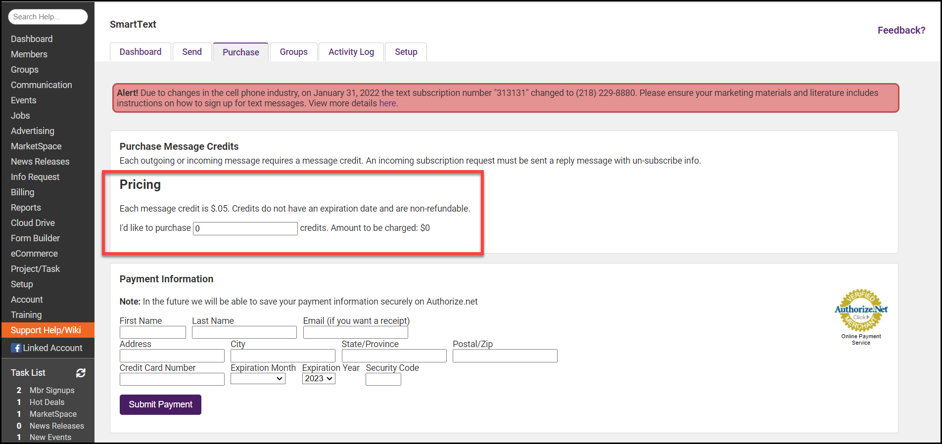 - In the I'd like to purchase text box, enter the number of credits you would like to purchase. Each message credit is $.05. Credits do not have an expiration date and are non-refundable.