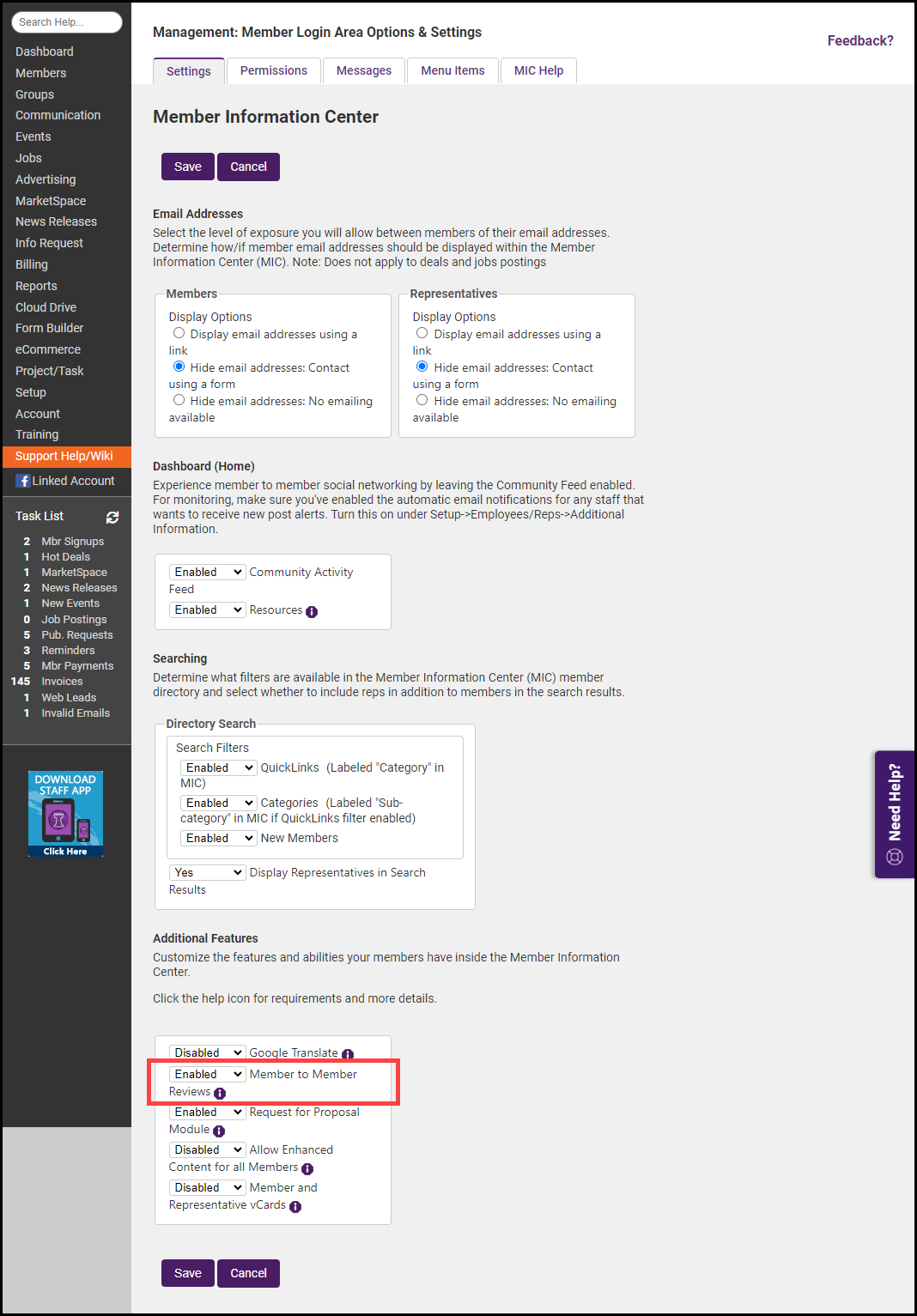 - On the Settings tab, enable Member-to-Member Reviews using the dropdown menu in the Additional Features section.