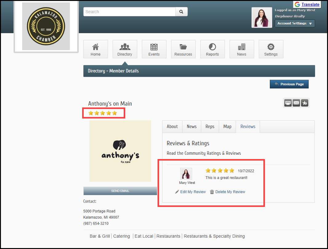 If enabled, members may leave reviews for other members using text and a star rating system in the Member Information Center (MIC). Members can edit or delete their reviews at any time. Staff can delete a review left by a member at any time.