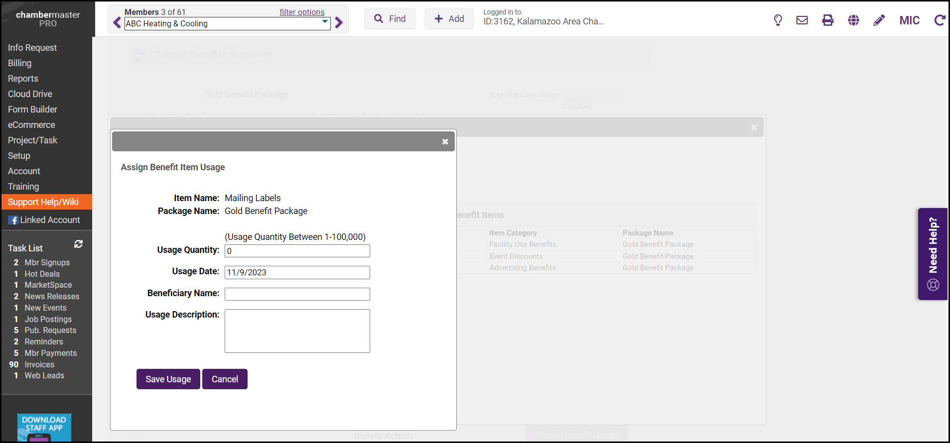 - In the Assign Benefit Item Usage window, enter information about the member's benefit usage.