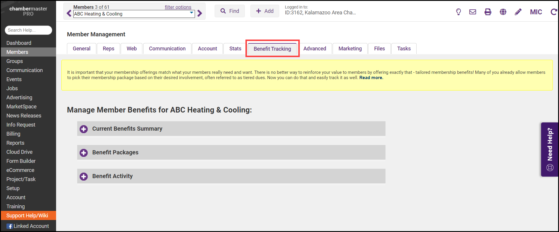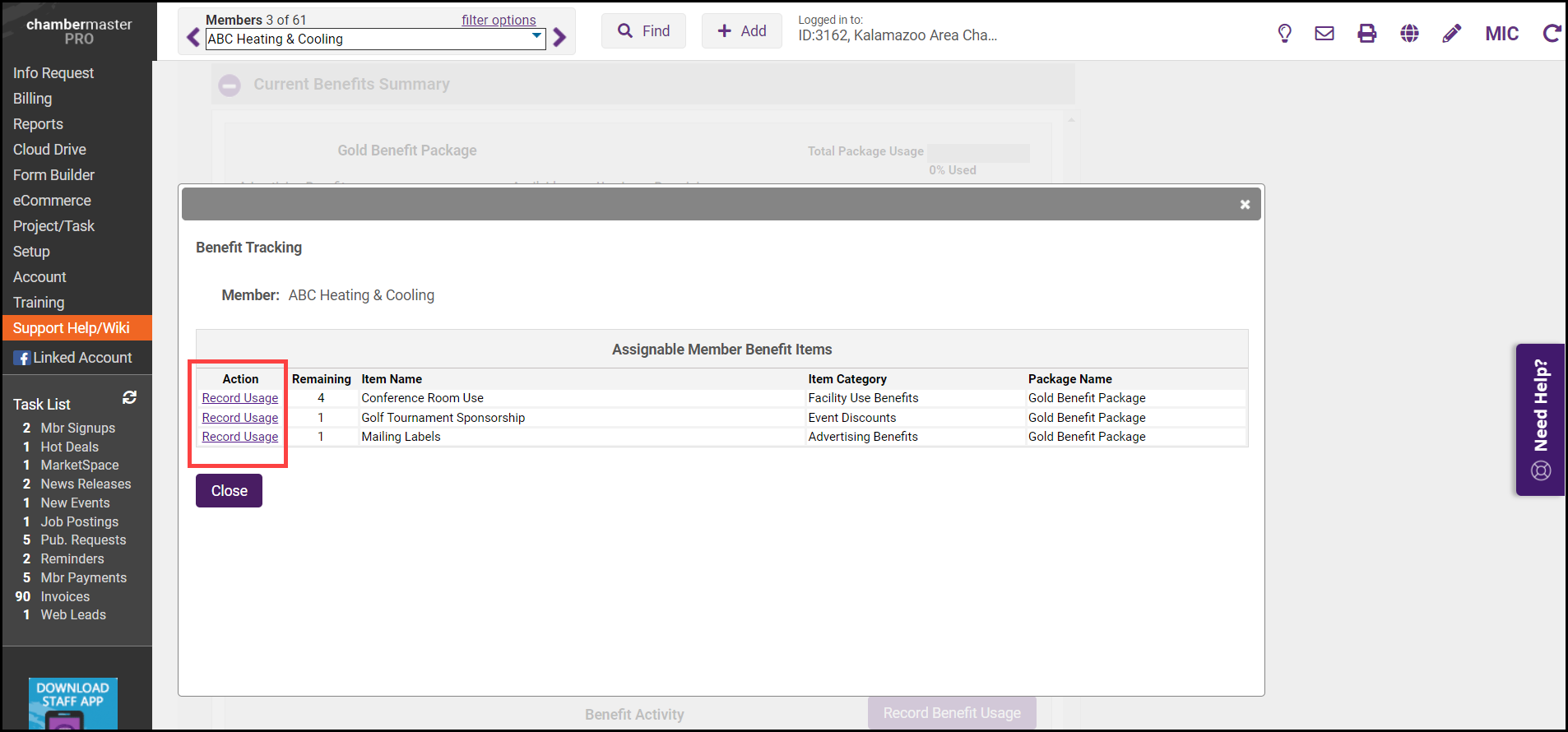 Benefit usage (for Standard Benefits) can be manually tracked on the member's Benefit Tracking tab. Standard benefit items must be manually tracked. Event benefit items can be manually tracked, or the usage can be automatically updated if a Benefit Item Discount has been created for the item and tied to an event.