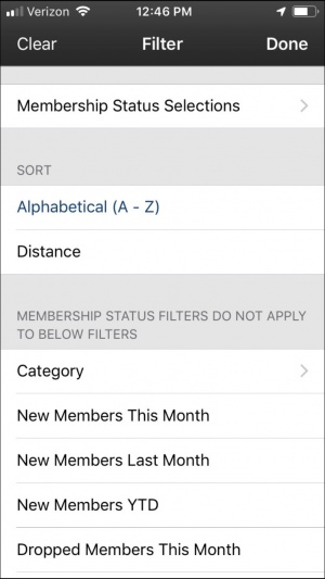 - Click Distance to sort contacts based on how close the member is to your current location. Distance is measured from the device location (not your office). The GPS feature in the device must be enabled for the distance to display. NOTE: Membership Status filters will be applied.