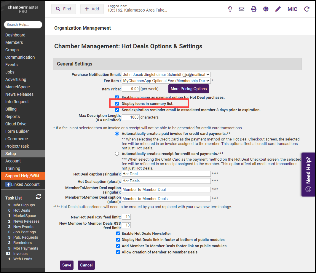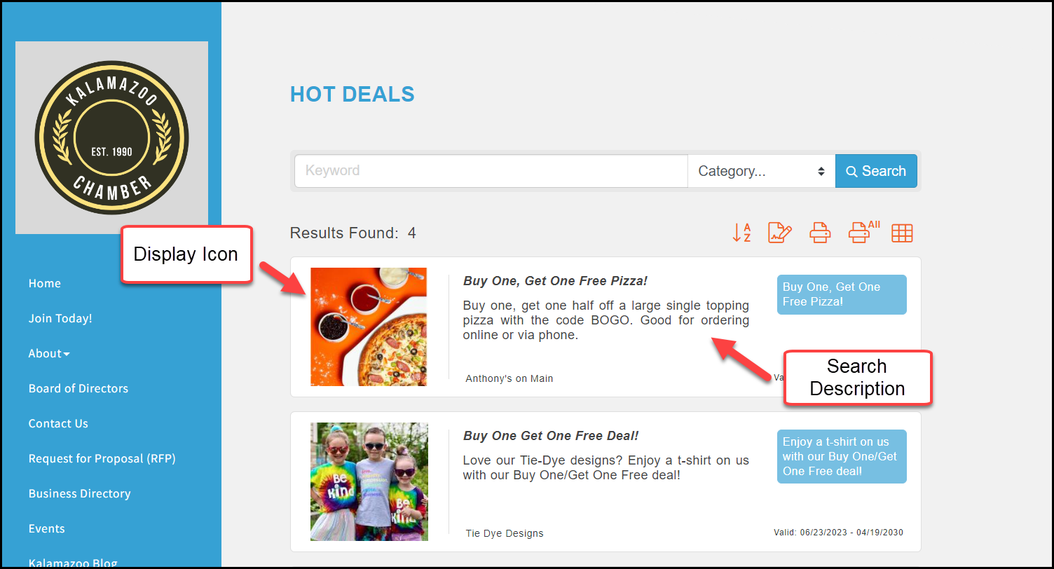 Display icons in summary list: When selected, display icons will show the graphic that has been selected in that deal on the public website in the search results in addition to displaying on the coupon itself. Only available with SEO integration.