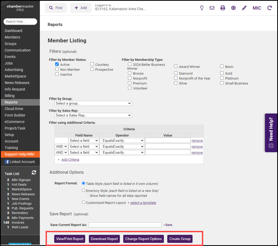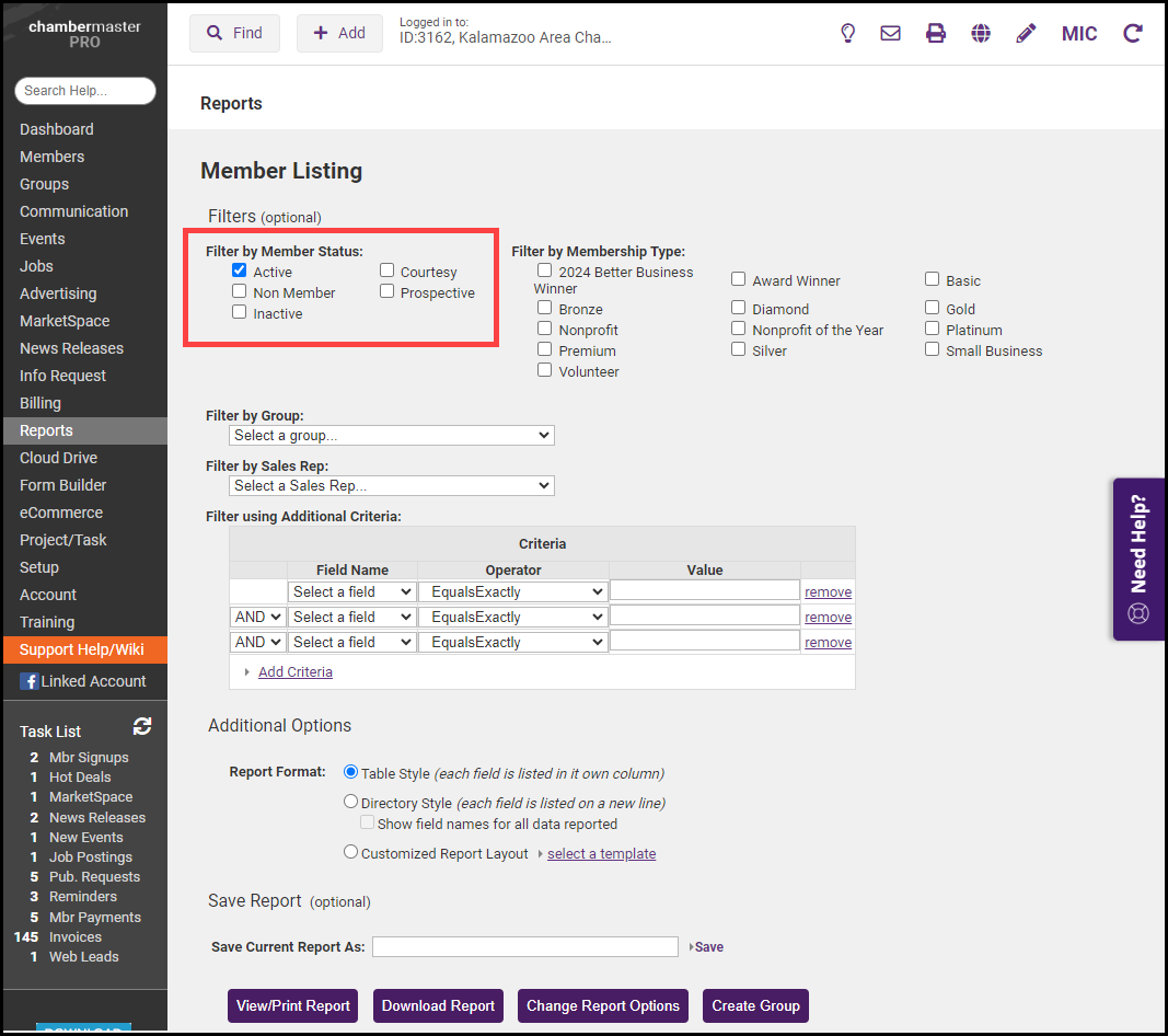 - In the Members Status section, select Active to include active members in the report.