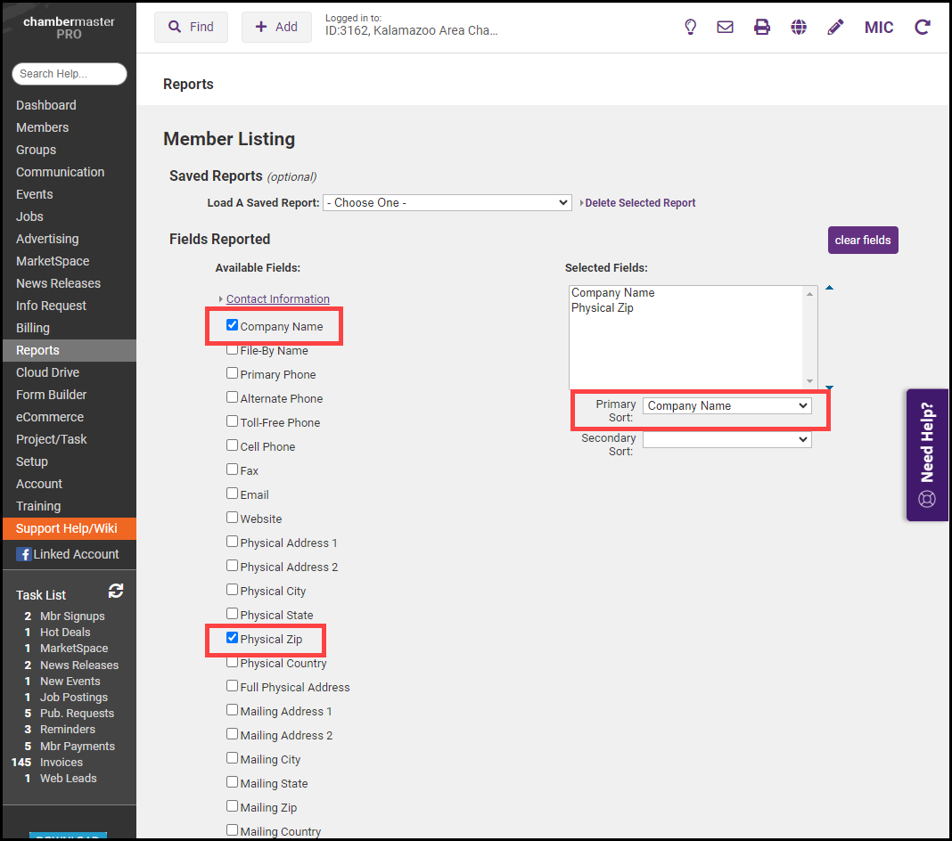 - In the Contact Information section, select Company Name and Physical Zip from the Available Fields. Select Company Name for the Primary Sort.