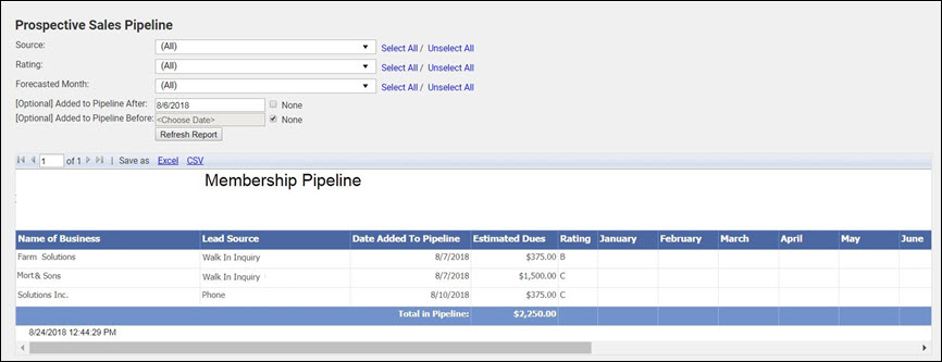 The Prospective Sales Pipeline Report can be filtered by the lead source of prospects, the quality rating of prospects, and what month you forecast this prospect to join.