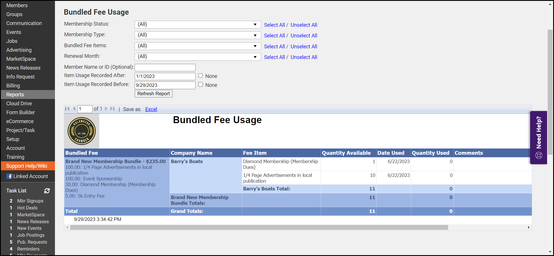 - Use the options to filter your report based on Membership Status, Membership Type, Bundled Fee Items, Renewal Month, Member's Name, and Dates of item usage.