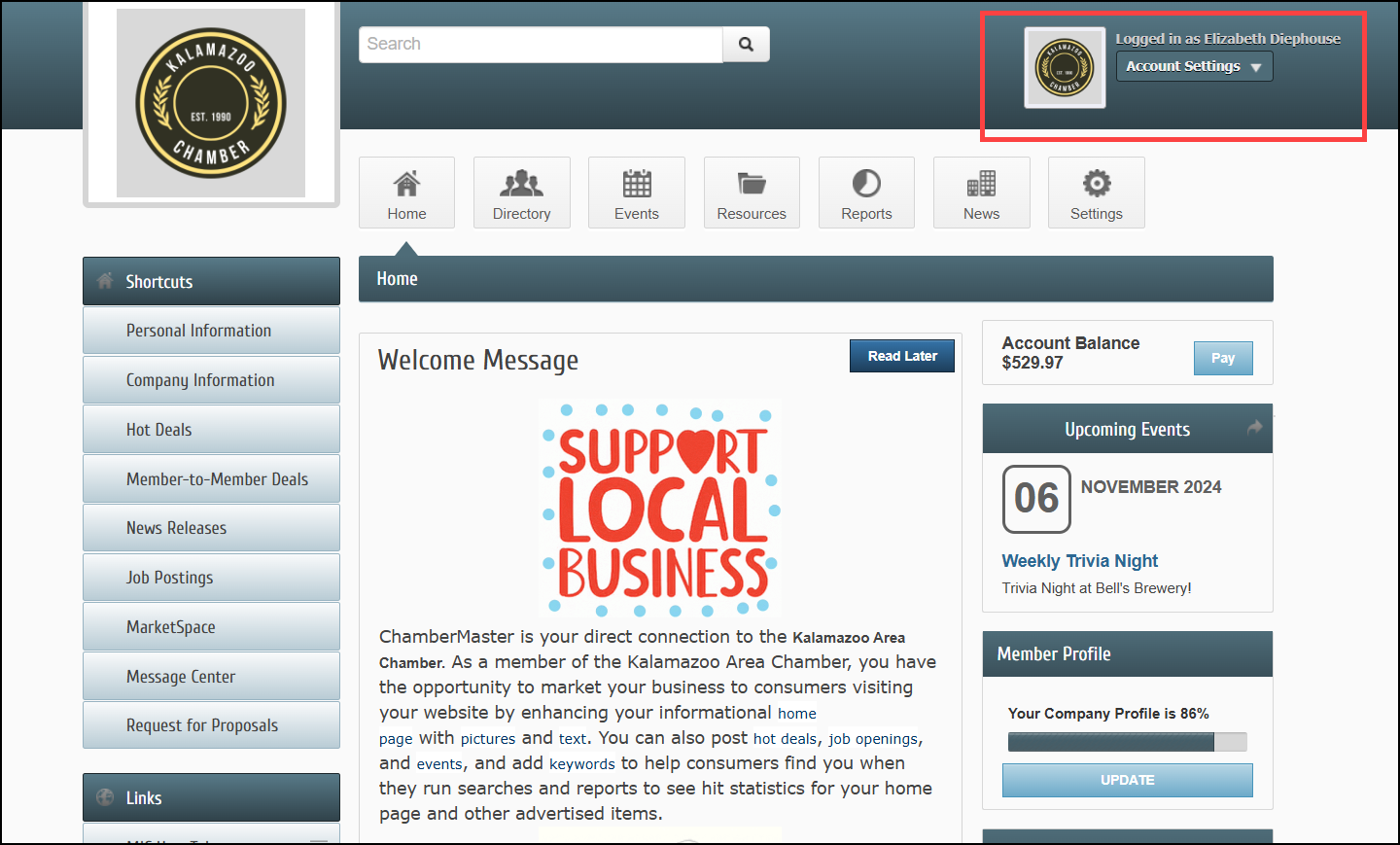 - Verify you're logged in as a staff member in the upper-right corner. Your name will be displayed along with the logo for your organization.