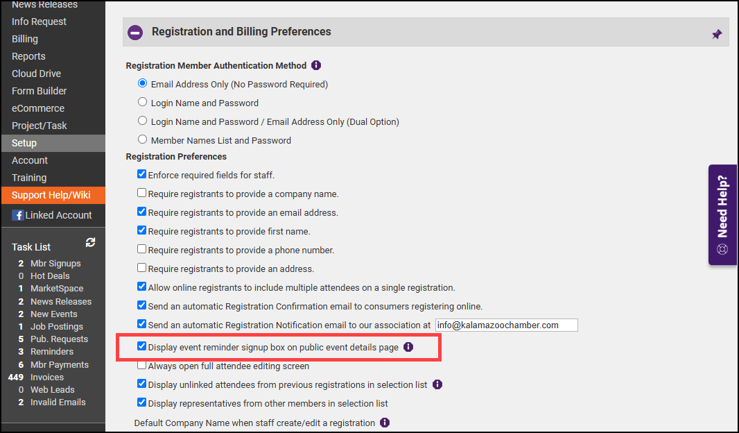 - In the Registration and Billing Preferences section, select the Display event reminder signup box on public event details page checkbox.