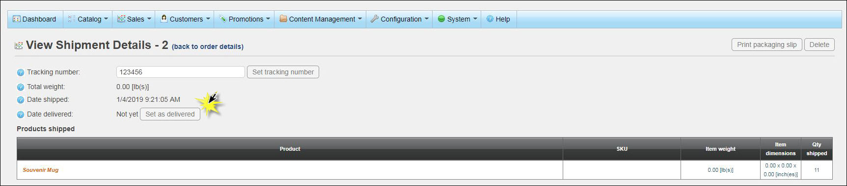 NOTE: Today’s current date and time will automatically be set as the delivered date/time. No other date or time may be specified and this date/time may not be undone. - Click Save. An email notification, ShipmentDelivered.CustomerNotification under Content Management->Message Templates is automatically sent to the purchaser when this date is set and the email is marked as active. This Delivered date is also visible to customers that choose to check their order status by logging into the storefront. Note: The order will continue to show as “Processing” until a delivered date is added.