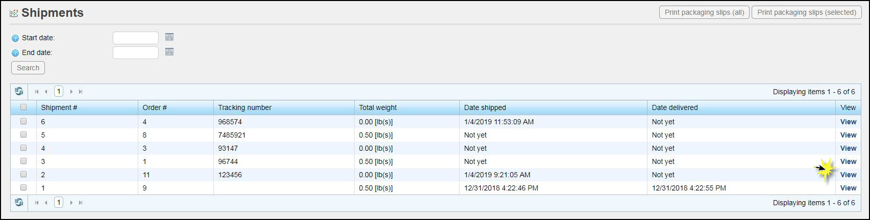 - Click the View link of for the shipment you wish to mark as delivered.