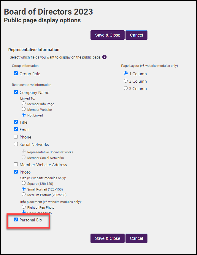 A Rep's Personal Bio can be displayed if the rep is in a group that you are displaying publicly. This is an excellent option for your staff or board of directors.