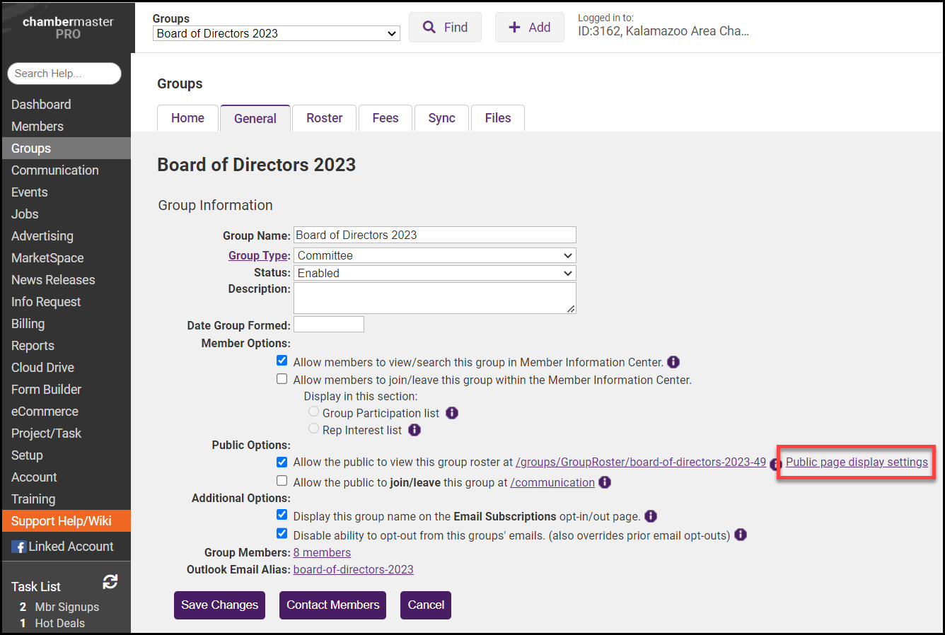 - In the group's General tab, under Public Options, select Allow the public to view this group roster option.