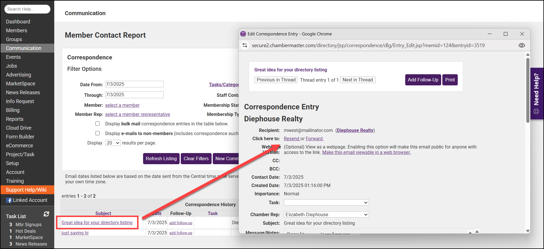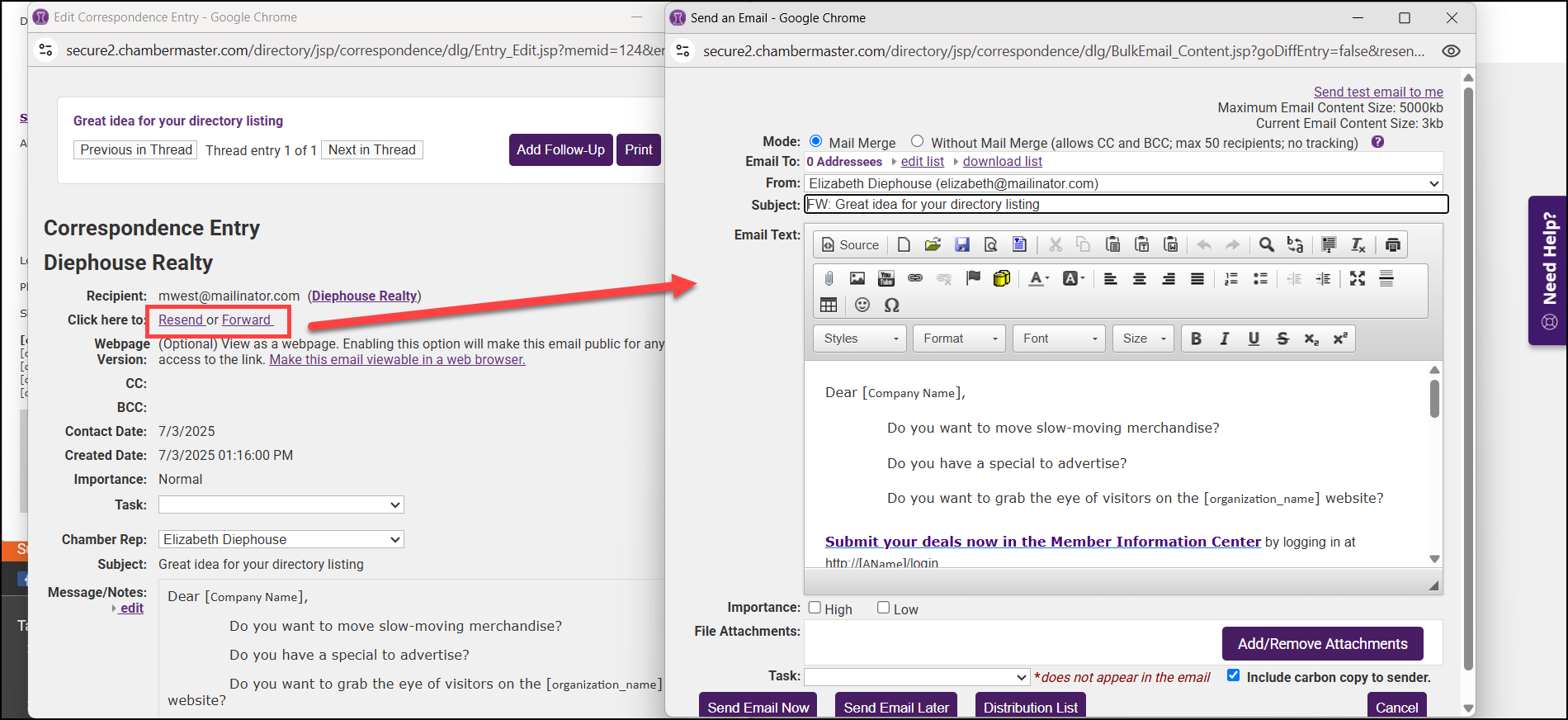 Save time and avoid duplicate work! If you need to resend a past message or forward it to a new contact, you can do it in just a few clicks with ChamberMaster’s built-in tools.