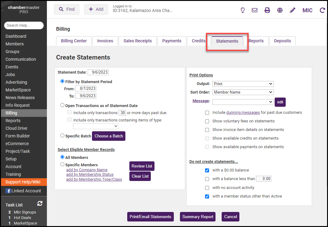 Select the Statements tab within the Billing module.