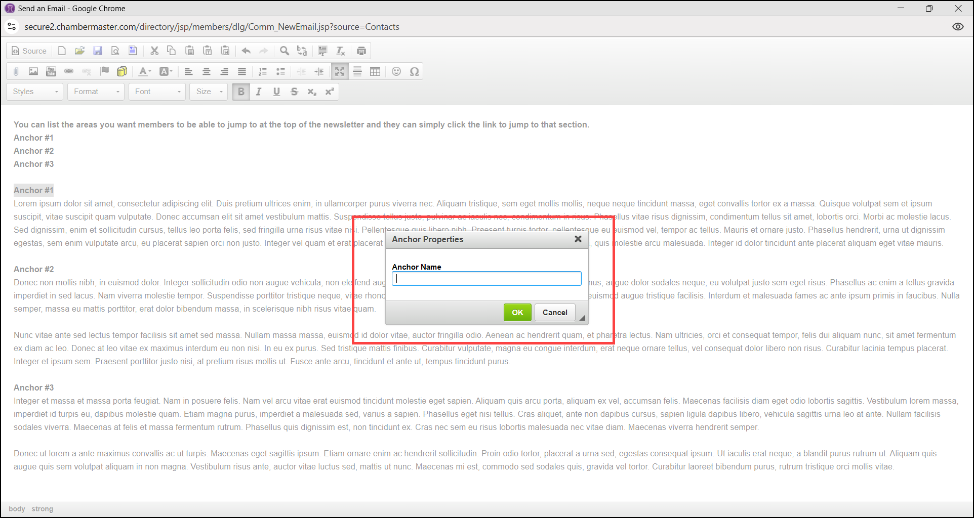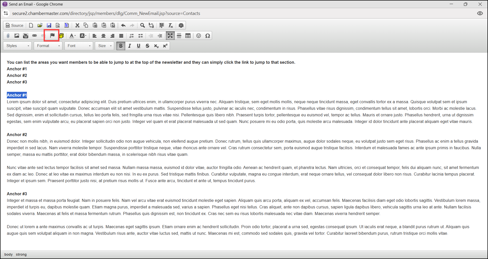 - In the email window, highlight the text you would like to make an anchor and select the Anchor icon.