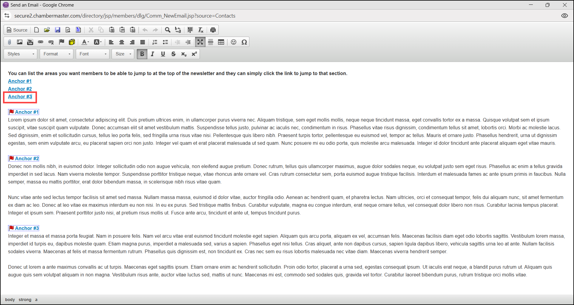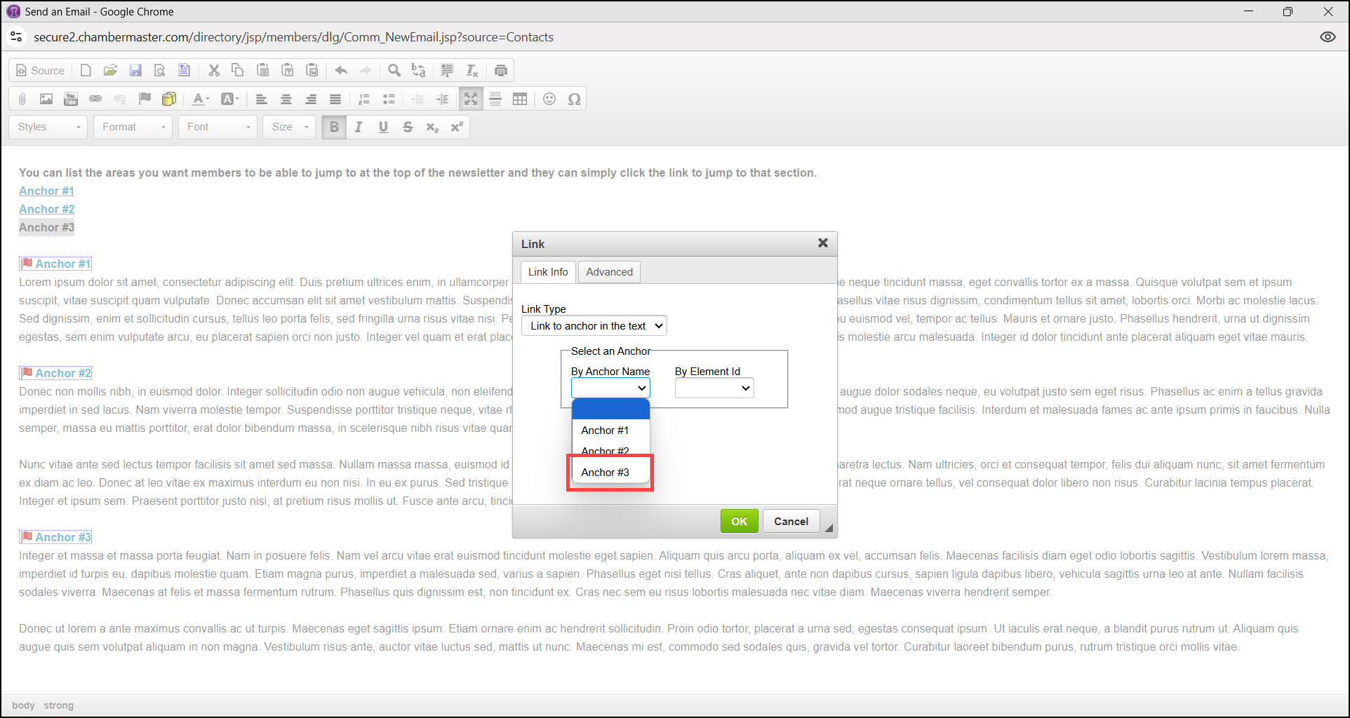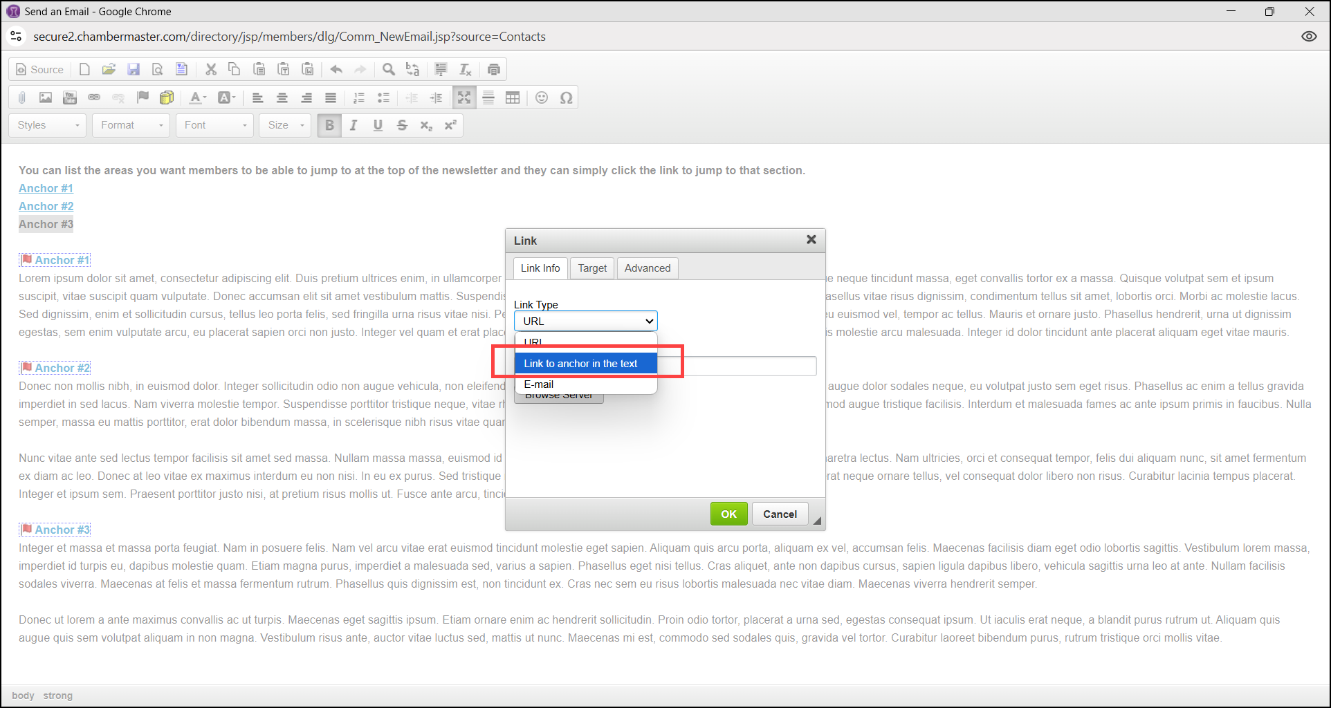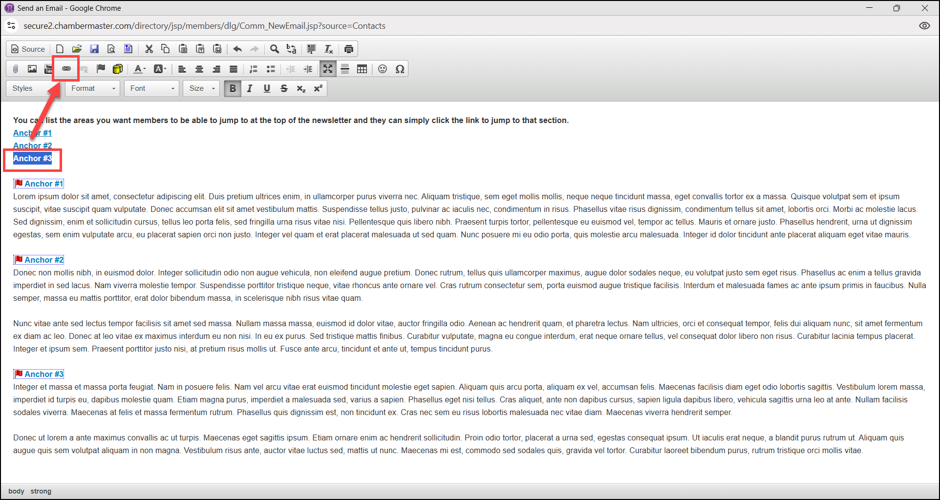 - In the email window, highlight the link text you would like members to click on to jump to that section of the email and select the Link icon.