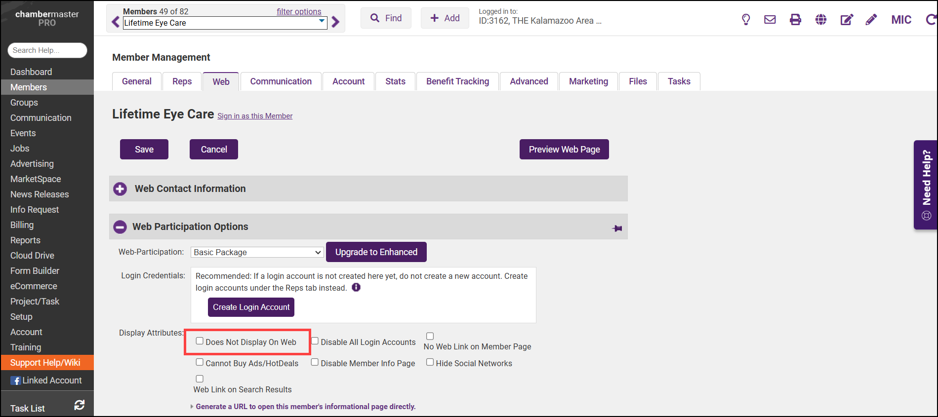 - In the Web Participation Options section, select the Does Not Display on Web checkbox. The member will no longer display in the directory on your public website or in the MIC.