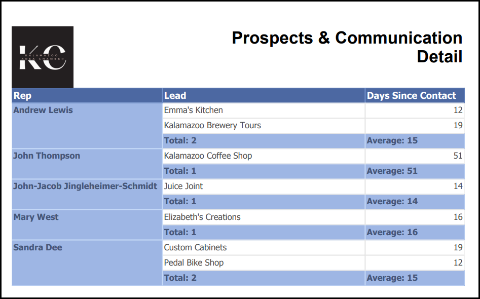 The Prospects and Communication by Rep: Detail report provides a detailed list of Sales Representatives and all of the prospective members associated with them. It includes a list of prospective members by Rep and the number of days since each prospective member was contacted. The report may be exported to PDF, Excel, or CSV.