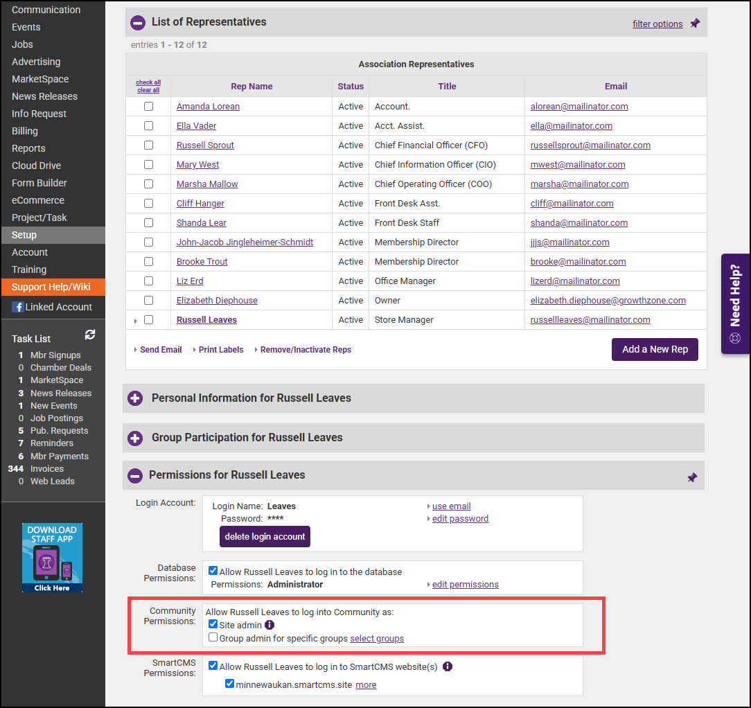 - In the Permissions section, select the checkbox to make the staff member a Site admin for Community.