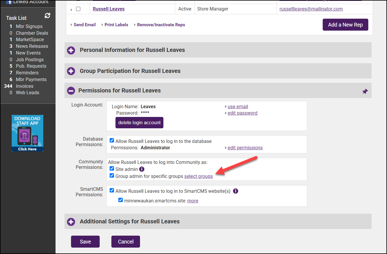 - Select the checkbox to make the staff member a Group admin and click the select groups link.