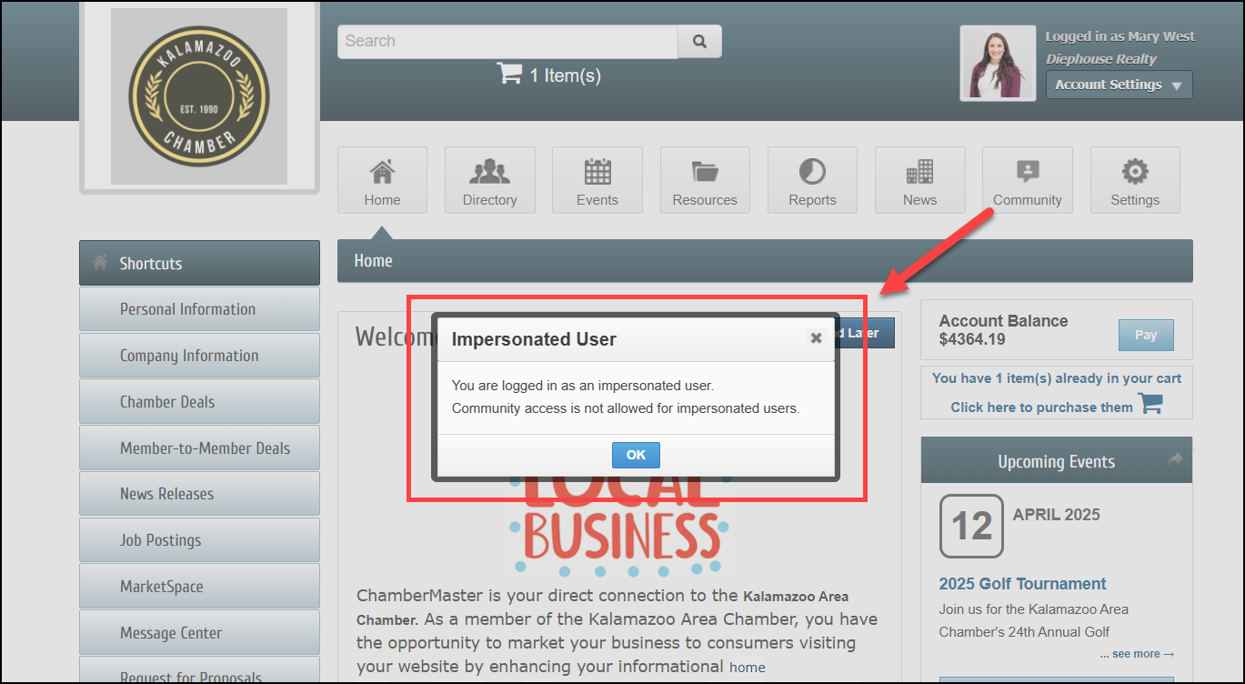 - Staff cannot impersonate member's in Community like they can in the Member Information Center (MIC). This will result in an error message.