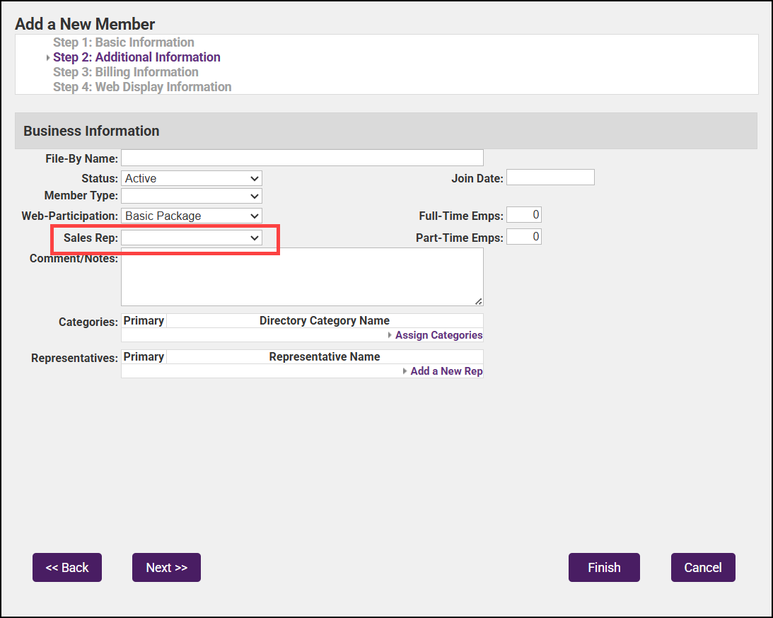 Staff members can be assigned to a member during the setup process or after a member has been added. In the Setup Wizard, the field is called Sales Rep but will display as Chamber Rep in the Members module.