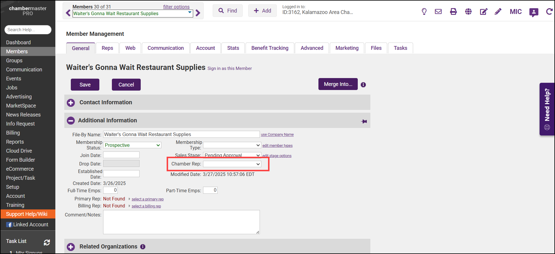 - Use the Chamber Rep dropdown to select the appropriate staff member.