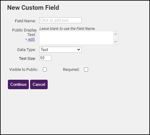 Public Display Text (optional): This is the text that will be displayed on the event registration form. For example, if you are creating a "Meal" field for the selection of a meal choice on an Event, you may wish to enter "Please select your meal choice" to be displayed to the public.