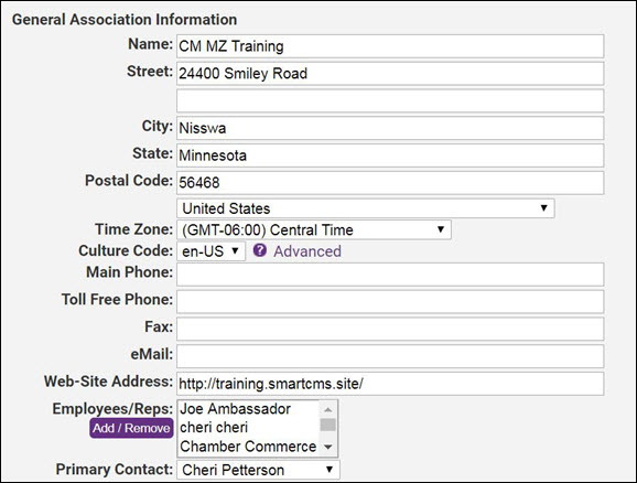 - Ensure your association's name and address are complete and accurate. This address is used where addresses are automatically pulled from the database. For example - it will be used on the default invoice template.