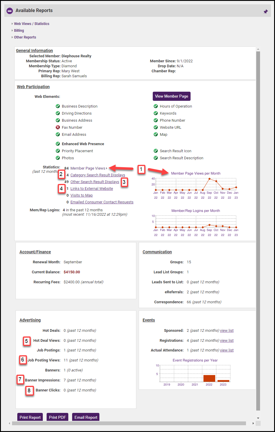 - Member Page Views: Displays the number of times the member information page was clicked on to be viewed. Also displayed in a graph.