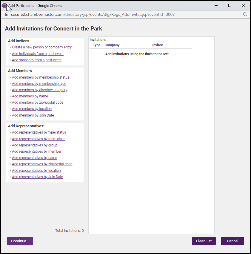 Select the attendees that should receive invitations using one or more selections available under Add Invitees, Add Members, or Add Representatives. Repeat until your invitee list is complete.