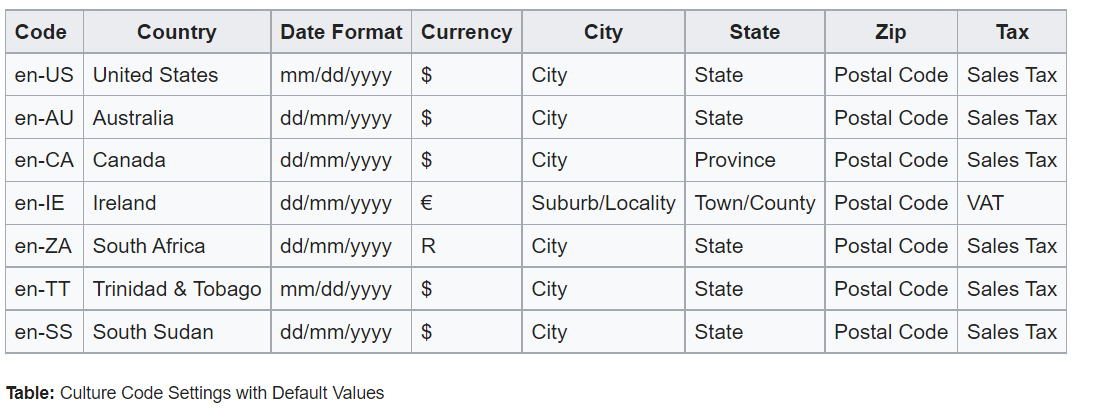 The "Culture Code" setting controls the defaults for date format, currency symbol, and verbiage for City, State, Zip, and Sales Tax in the back office, Member Information Center, and public modules.