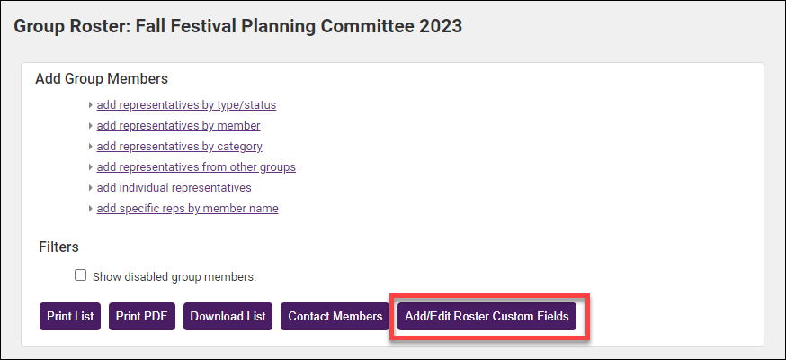 Custom Fields are designed to give ultimate flexibility in managing your data. When adding a custom field, you will create a database field that is available across all member records for tracking additional desired information. If there is certain information that you would like to track about representatives in your groups, you can add custom fields. View the video explanation.