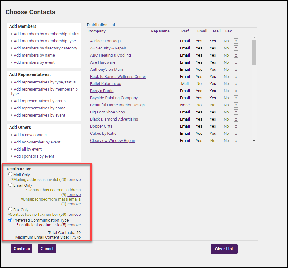 NOTE: Addresses selected under the Add Members heading will use the contact information found on the General tab of the member’s record. Addressees selected under the Add Representatives heading will use the contact information found on the Reps tab of the selected individual rep.