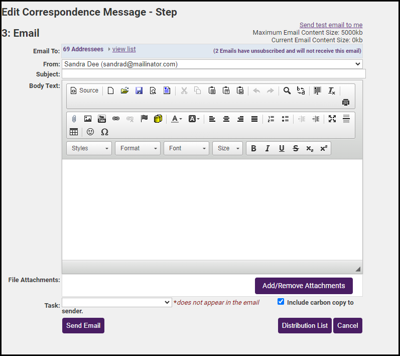 - Make any modifications to the email output. Make sure to type a subject line. Add attachments and links as desired.